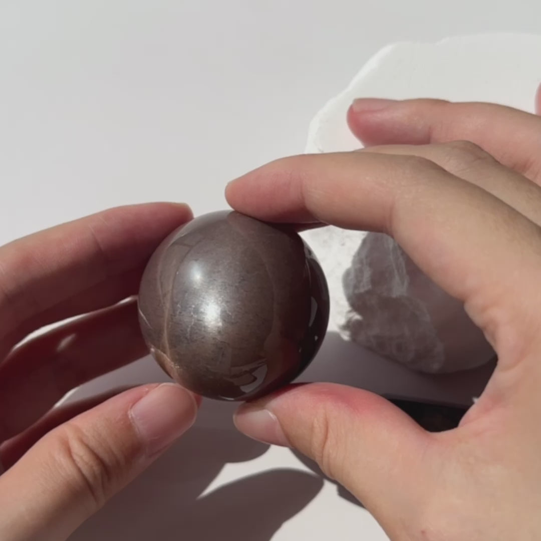 ブラック オレンジ ムーンストーンの球体は、オレンジ ゴールド、赤、茶色の暖色系の色合いです。この石の組成により、ムーンストーンとサンストーンの要素が内部に含まれています。このため、この石は独特の光沢を放ち、赤みがかった金茶色の粒子が日光の閃光や斑点のように見えます。さまざまな角度から見ると、虹彩効果も現れ、石の交差層が見えて非常に美しいです。この石は、その美しさとエネルギー特性から人気があります。ブラック オレンジ ムーンストーンは希少で、コレクターにも人気の石です。