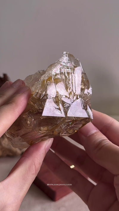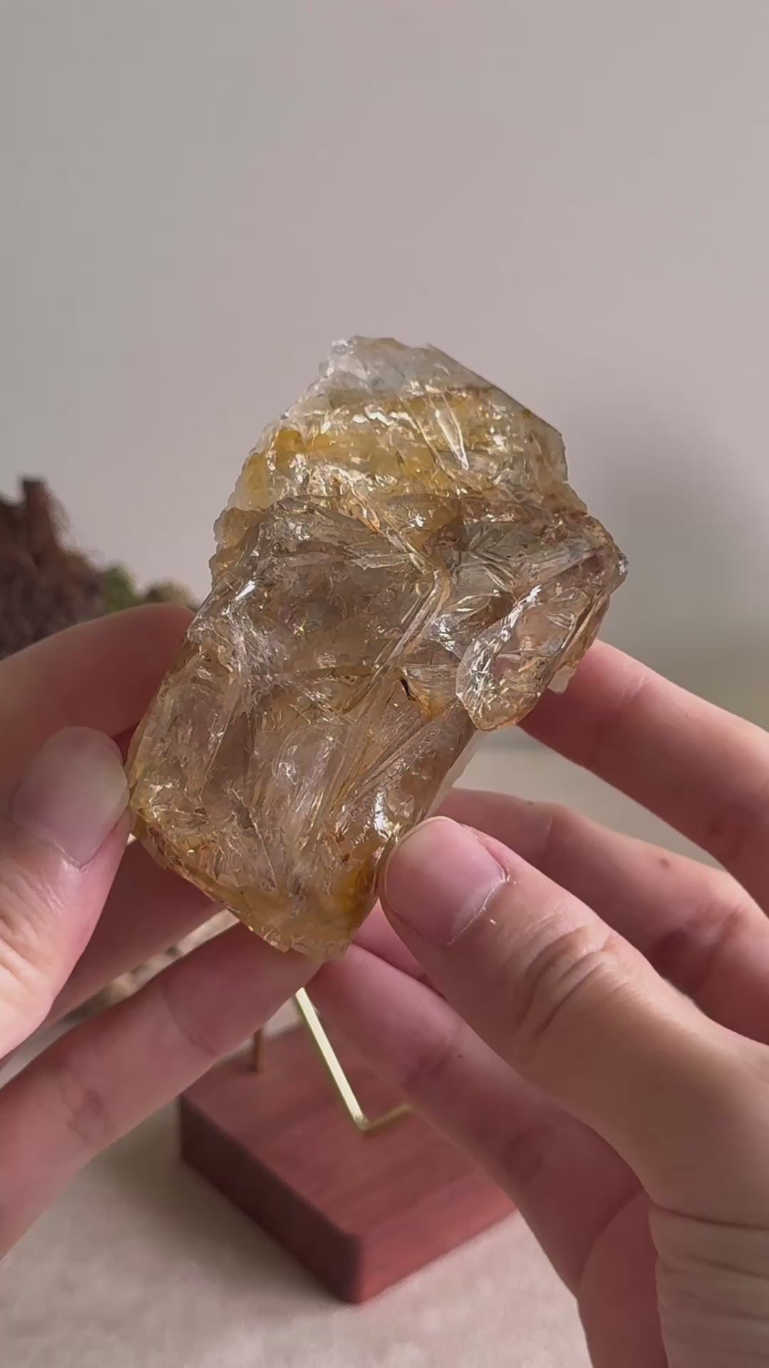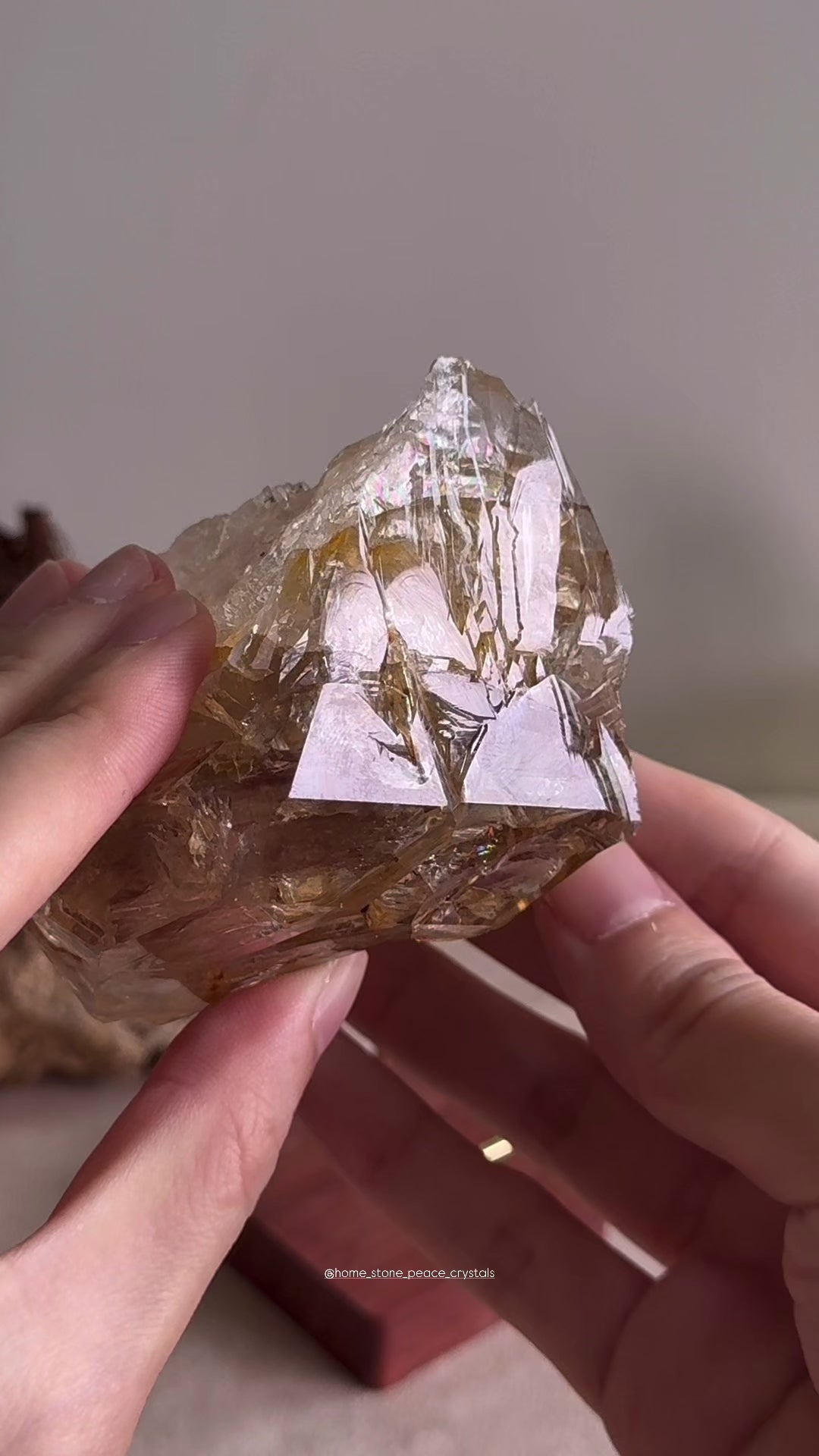 此赫基蒙鑽石擁有高光澤度呈現高度反光面,和典型Hawk Nose (鷹鼻) 扭曲狀晶體形態,而且有明顯骸骨生長紋,是其中一種常見且辯識度高的紐約礦區出產的特徵。此赫基蒙鑽石內外都包含了黄金療癒者(黄金色黄膠花),和明顯彩虹,屬於目前市場上愛好原石水晶的人士熱門追求之一。