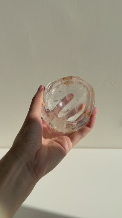 黃金療癒者(又名黃膠花),有平衡「陰」和「陽」的能量,能使能量的流動暢順,整理人體脈輪,使人拋開舊有思想和模式。對於療癒倦怠和失意的心身靈,有更加顯著的幫助。含黃金療癒者的水晶亦被認為有帶來財富和好運的顯化能力。此美麗通透的水晶小碟可用於放置水晶飾物,為水晶注入新力量。 ©HSP