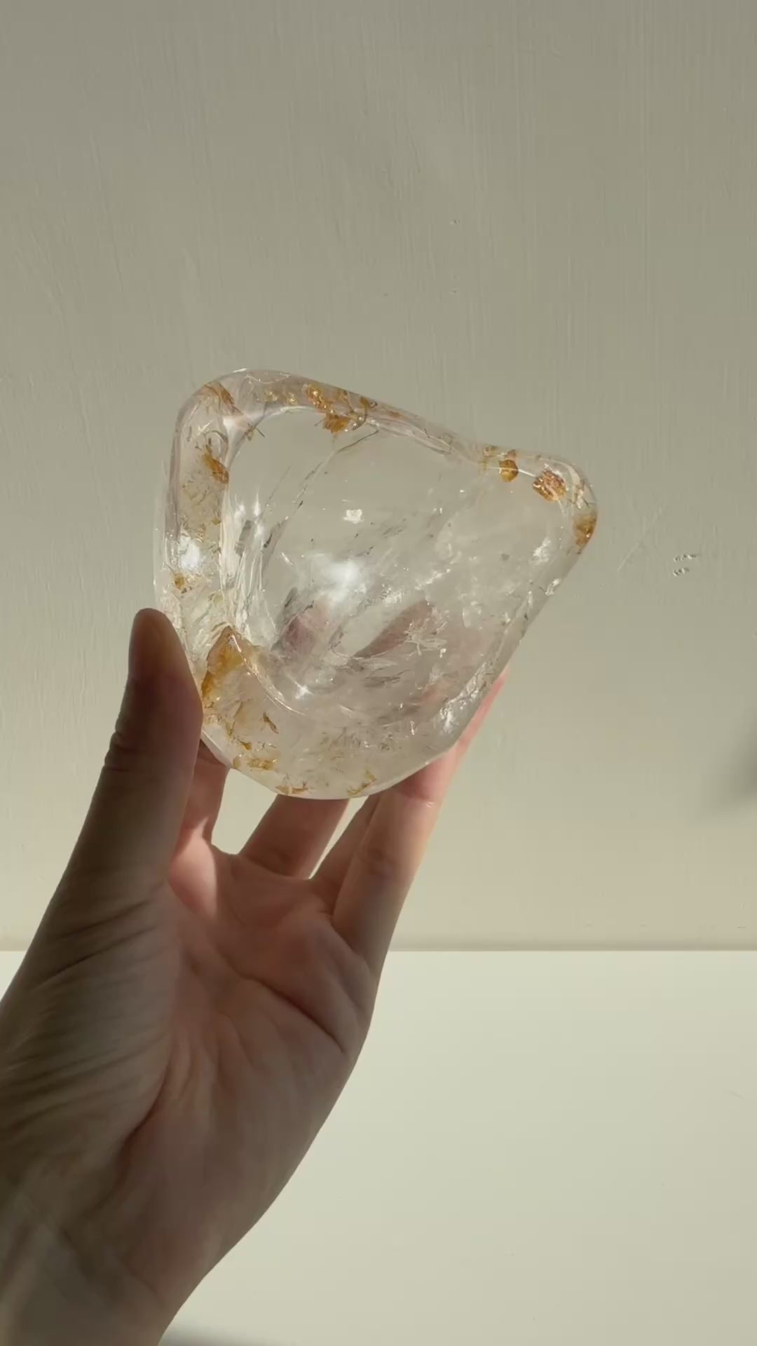 黃金療癒者(又名黃膠花),有平衡「陰」和「陽」的能量,能使能量的流動暢順,整理人體脈輪,使人拋開舊有思想和模式。對於療癒倦怠和失意的心身靈,有更加顯著的幫助。含黃金療癒者的水晶亦被認為有帶來財富和好運的顯化能力。此美麗通透的水晶小碟可用於放置水晶飾物,為水晶注入新力量。 ©HSP