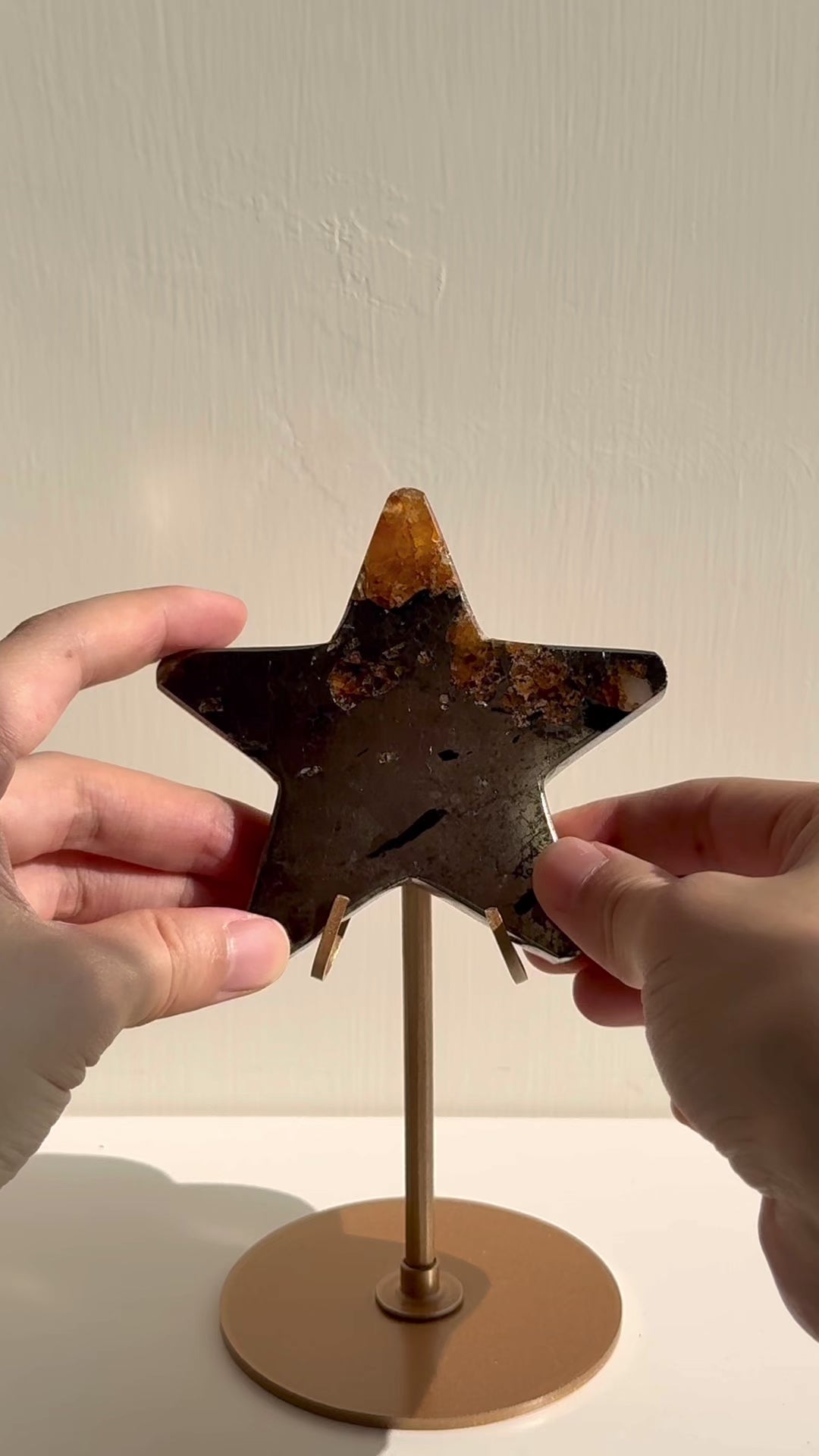 This high grade Indonesian pyrite is collected by many and are recognized as a symbol of good fortune and prosperity. Placing pyrite near a wall in an office or shop is like letting the sun enter your premises and helps cultivate the power of brightness, confidence, wealth, abundance and prosperity. Placing pyrite in your office or home will help amplify these intentions. Pyrite can also boost self-confidence and optimism, convert negative energy into positive energy, improve brain and respiratory health as well as make people face their true selves. This pyrite star with golden healer look attractive in the home or workplace helping attract an abundance of wealth and good fortune. ©HSP