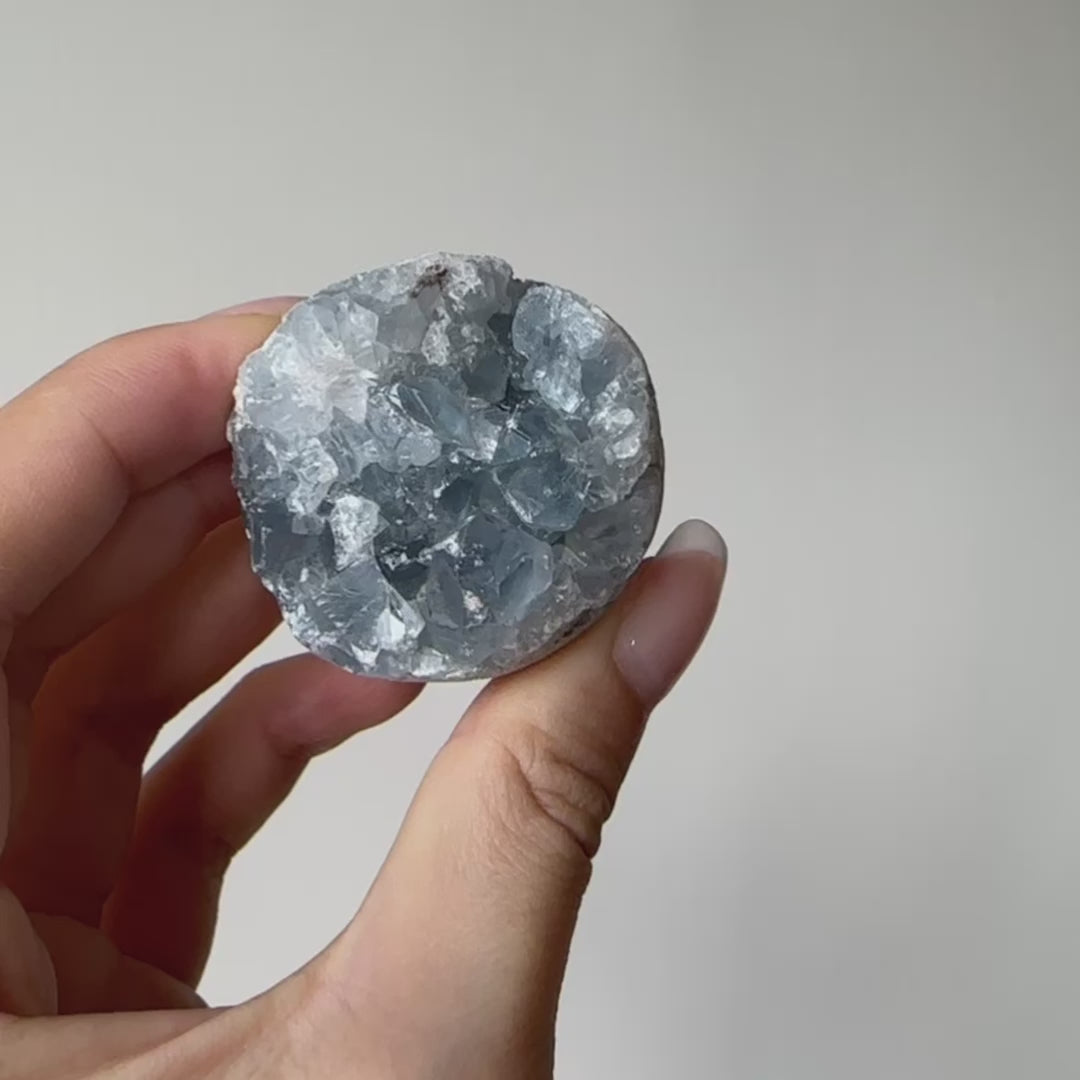 Blue colored Celestite is most popular with collectors due to its genuine color and appearance which is often noted as a stone made by angels. It is often used for mediation and helps strengthen the third eye chakra. By strengthening the third eye chakra it can help elevate wisdom and understanding. During meditation celestite can help provide high vibrational energy making you feel more focused, energized and optimistic. It is also often used for spiritual and angelic realm communication and provides a gentle powerful energy. Some people also like to put this crystal in the bedroom to use it for aiding with deep sleep and remembering your dreams. These beautiful Celestites look great in the home and would blend in with most aspects of the household.©HSP