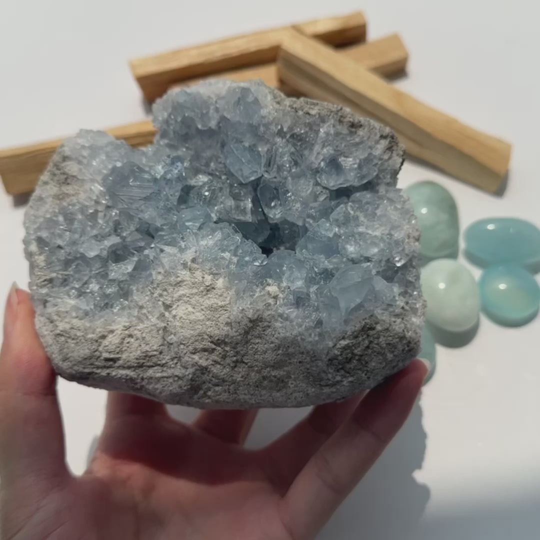Blue colored Celestite is most popular with collectors due to its genuine color and appearance which is often noted as a stone made by angels. It is often used for mediation and helps strengthen the third eye chakra. By strengthening the third eye chakra it can help elevate wisdom and understanding. During meditation celestite can help provide high vibrational energy making you feel more focused, energized and optimistic. It is also often used for spiritual and angelic realm communication and provides a gentle powerful energy. Some people also like to put this crystal in the bedroom to use it for aiding with deep sleep and remembering your dreams. These beautiful Celestites look great in the home and would blend in with most aspects of the household.©HSP