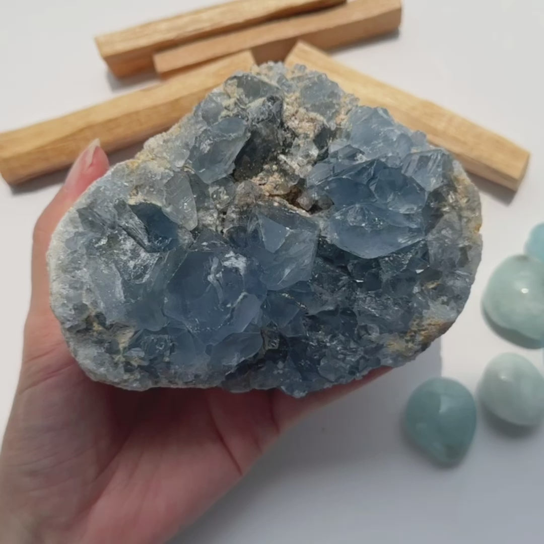 Blue colored Celestite is most popular with collectors due to its genuine color and appearance which is often noted as a stone made by angels. It is often used for mediation and helps strengthen the third eye chakra. By strengthening the third eye chakra it can help elevate wisdom and understanding. During meditation celestite can help provide high vibrational energy making you feel more focused, energized and optimistic. It is also often used for spiritual and angelic realm communication and provides a gentle powerful energy. Some people also like to put this crystal in the bedroom to use it for aiding with deep sleep and remembering your dreams. These beautiful Celestites look great in the home and would blend in with most aspects of the household.©HSP