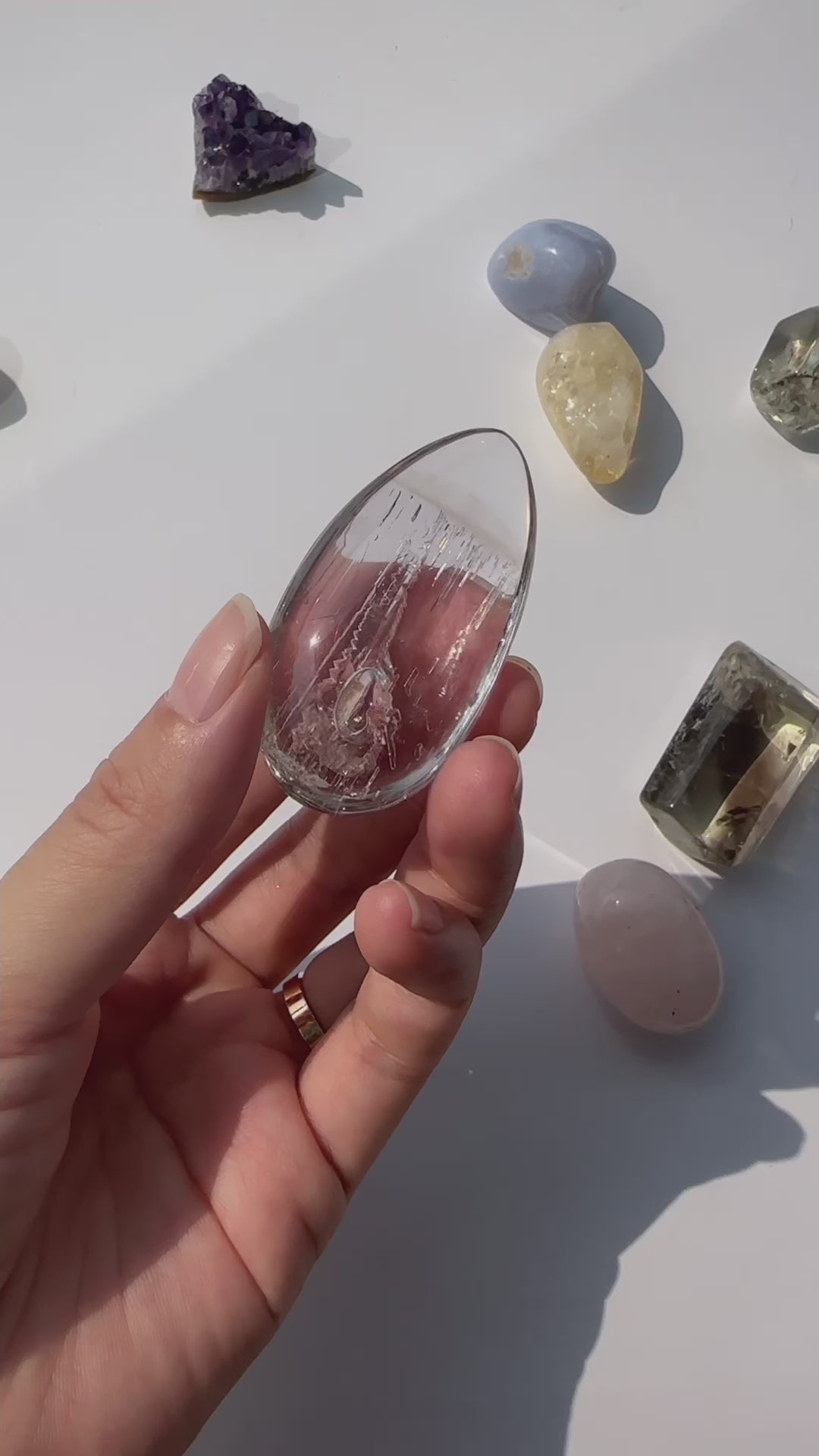 含有清澈而且活動的水膽在並出現在紫骸骨中的水晶中屬於非常罕有,亦象徵個性聰慧靈巧,懂得進退,高貴和與別人不同,這個透體的水滴形水膽紫骸骨水晶是一顆值得收藏的水晶佳品。©HSP