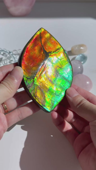 This stunning piece reflects beautifully its array of colors from within the fossil, especially when reflected in sunlight. These stones are lavishly beautiful pieces for all collectors and can provide peace and harmony. ©HSP