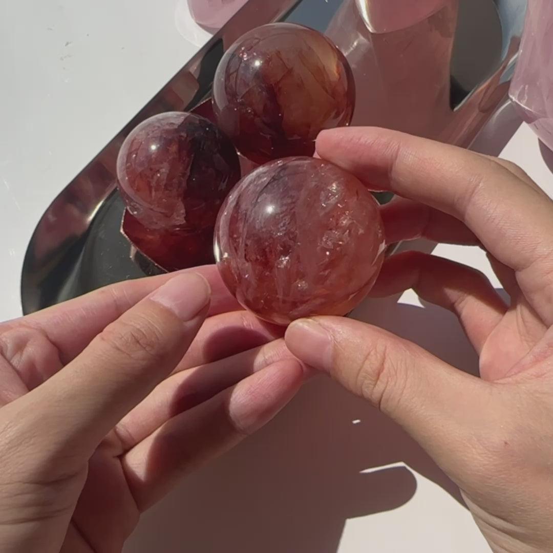 このファイアークォーツ球には美しいヘマタイトの含有物があり、日光の下に置くと美しい結晶になります。 ©HSP